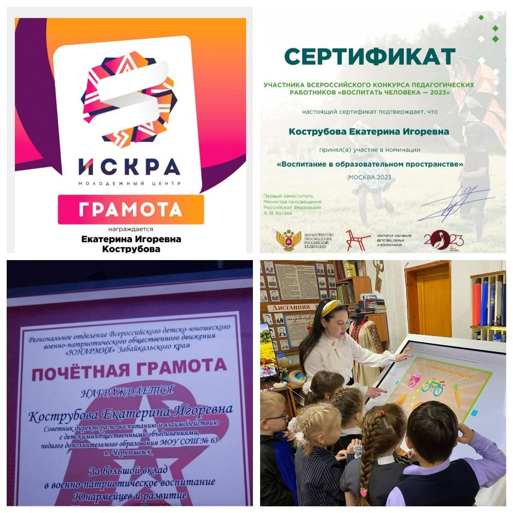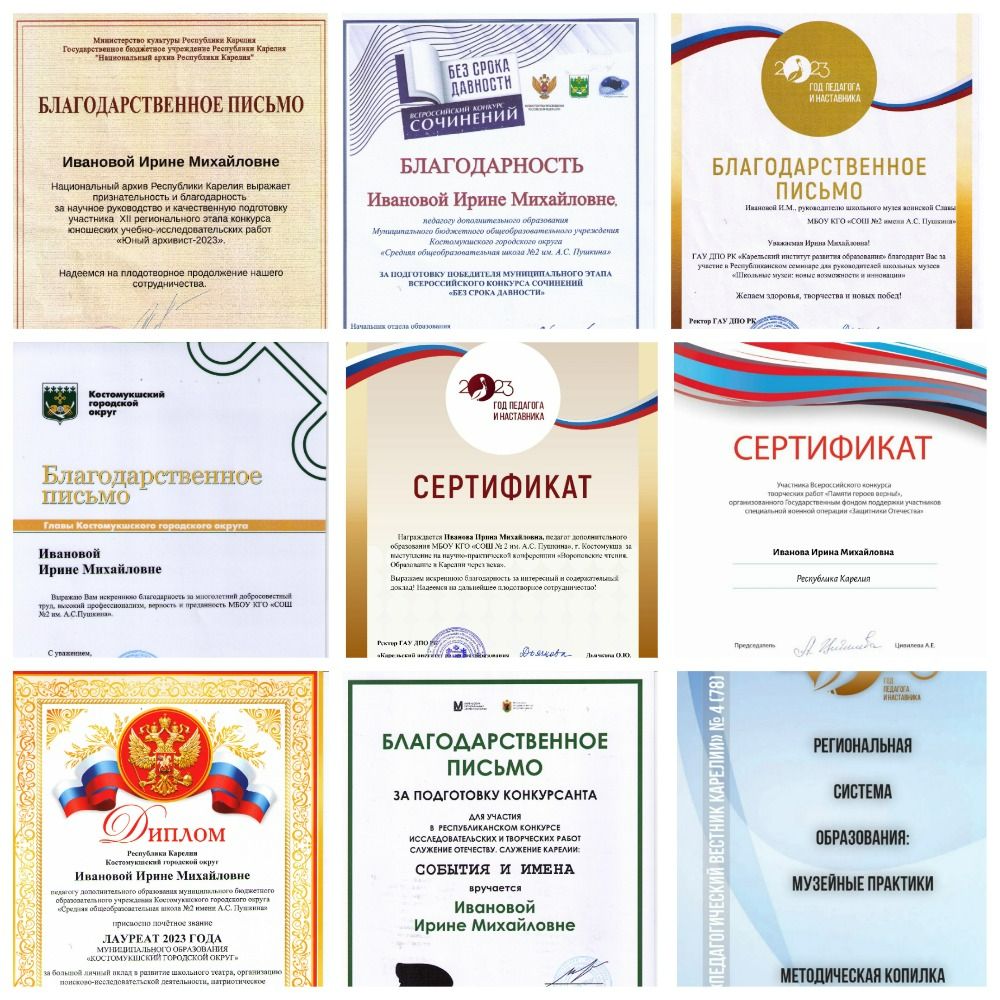 По результатам 2023 года я признана Лауреатом года в Костомукшском городском округе. Моя статья опубликована в республиканском издании "Педагогический вестник Карелии", приняла участие в муниципальных и республиканских семинарах, делясь опытом соединения театрального творчества и музейной работы."